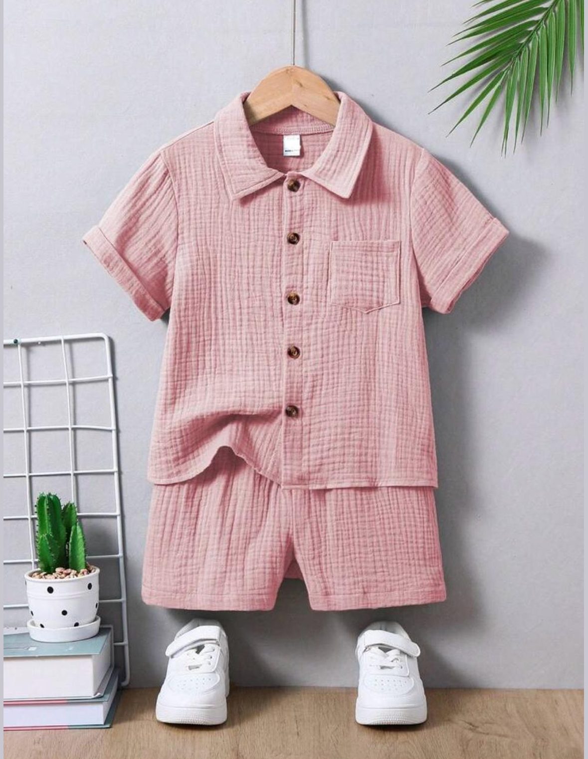 Let your little one stay cool and stylish in our Blush Breeze Cotton Co-Ord Set! This soft and breathable outfit includes a short-sleeved button-down shirt with a smart collar and chest pocket, paired with comfy matching shorts. Made from premium crinkled cotton, it’s perfect for playdates, outings, or just lounging in style. Available in sizes from 6-12 months to 6 years, this adorable pink set is a must-have for any mini fashionista’s wardrobe.