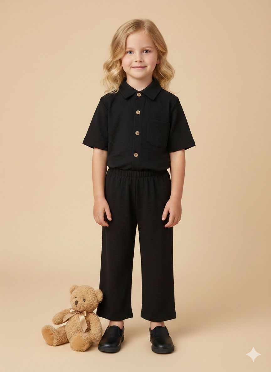 Keep her look effortlessly stylish with this classic black co-ord set, designed for comfort and everyday elegance. Featuring a short sleeve button down top paired with matching full length trousers, this outfit is perfect for playtime, outings, or special occasions.