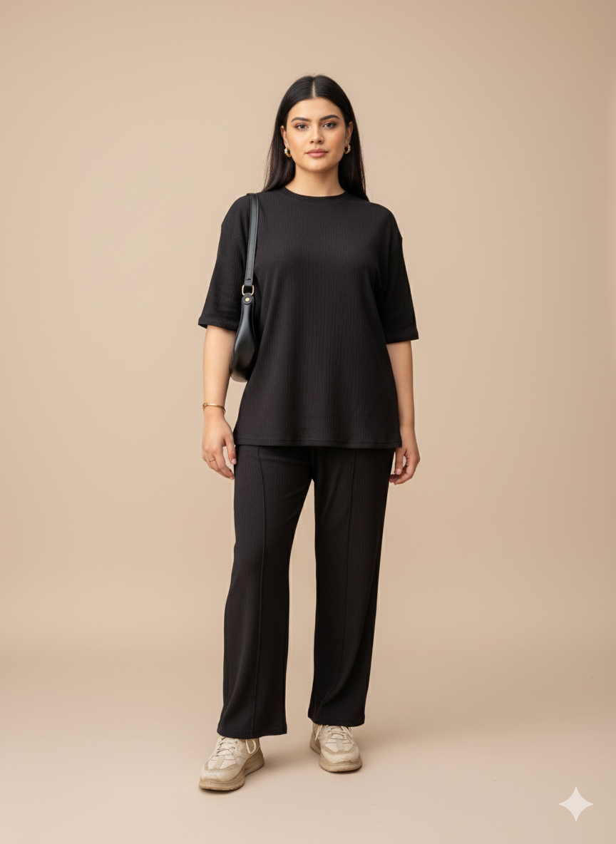 Elevate your everyday look with the Monochrome Muse Set. Designed in a relaxed silhouette, this co-ord features a half-sleeve top and straight-fit trousers for the perfect balance of comfort and style. The all-black design adds a sleek, versatile touch—ideal for casual hangouts, travel days, or an effortlessly chic streetwear vibe. Pair it with sneakers or accessorize for a dressed-up edge.